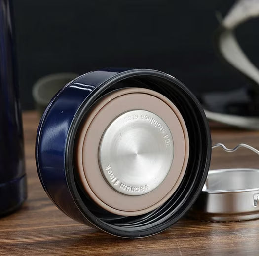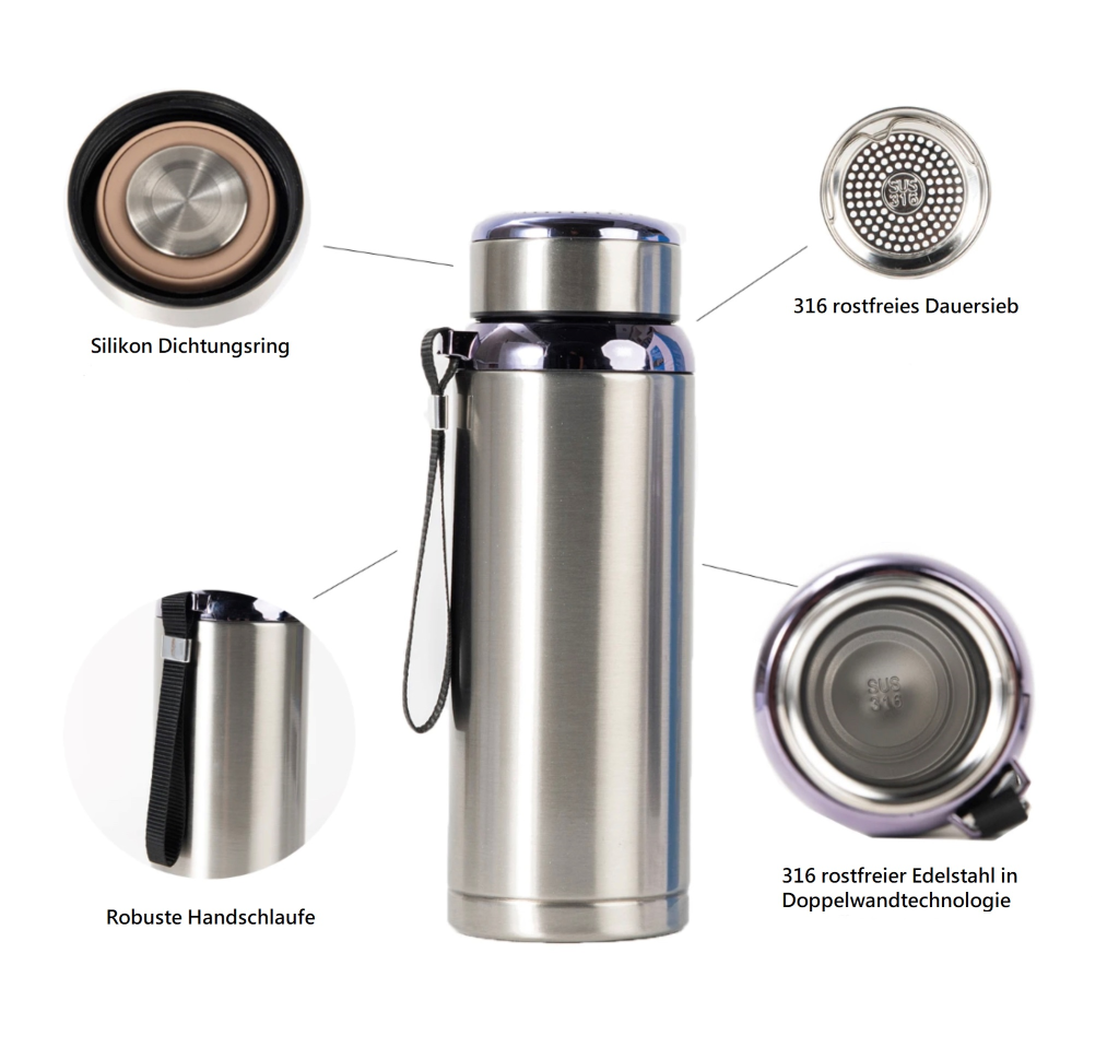 Mit auslaufsicherem Schraubverschluss, praktischer Handschlaufe und Edelstahl-Teesieb ideal für Kaffee, Tee, Wasser oder Erfrischungsgetränke – ob im Alltag, beim Sport, auf Reisen oder im Büro.